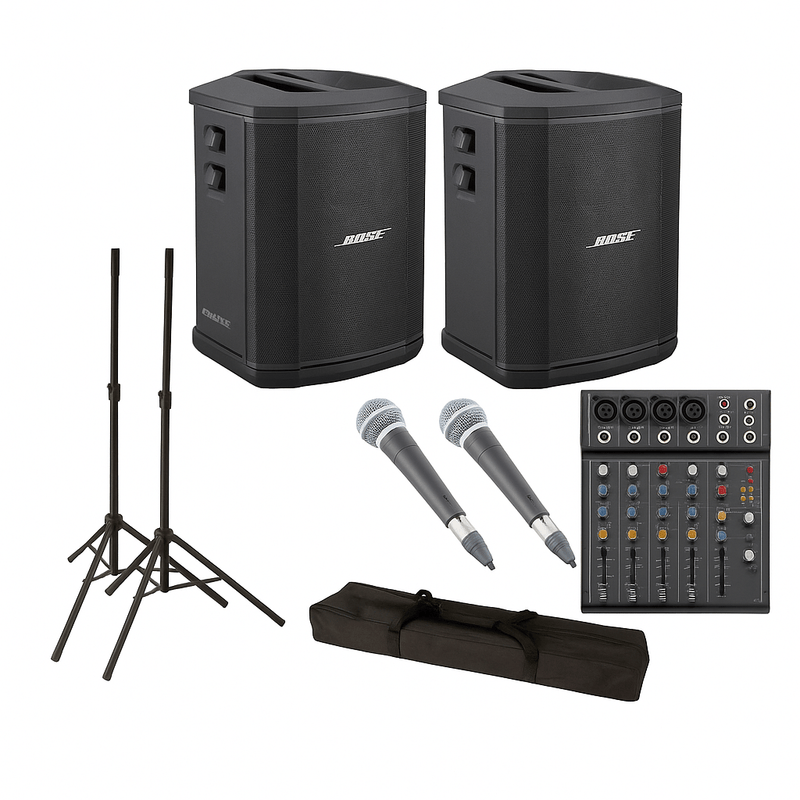 This all-in-one hire package includes two Bose battery-powered speakers, two wireless microphones, a Behringer battery-operated audio mixer, two adjustable speaker stands, and a carry bag for easy transport. Every component is designed for mobility and efficiency, allowing artists and event hosts to perform effortlessly in any location. Setup is fast, intuitive, and completely cable-free, giving you more freedom to focus on your sound and performance.