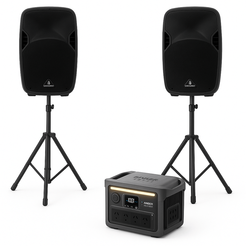This portable PA package pairs two powerful speakers with a battery power station, creating a clean, quiet, and eco-friendly audio solution for any event. Designed for outdoor gatherings, weddings, markets, and pop-ups, it delivers professional sound without the noise and fumes of a traditional generator. The setup is quick and fully mobile, allowing you to take your sound system anywhere with ease.