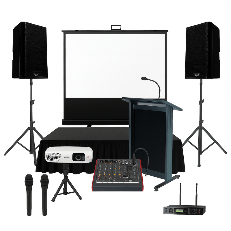 Transform your next meeting or business gathering with this conference package. The package includes a pull up projector screen with an HD projector on a tripod stand for easy setup. The package also includes conference speakers, a lectern mic and lectern as well as an audio mixing desk for ease of use.
